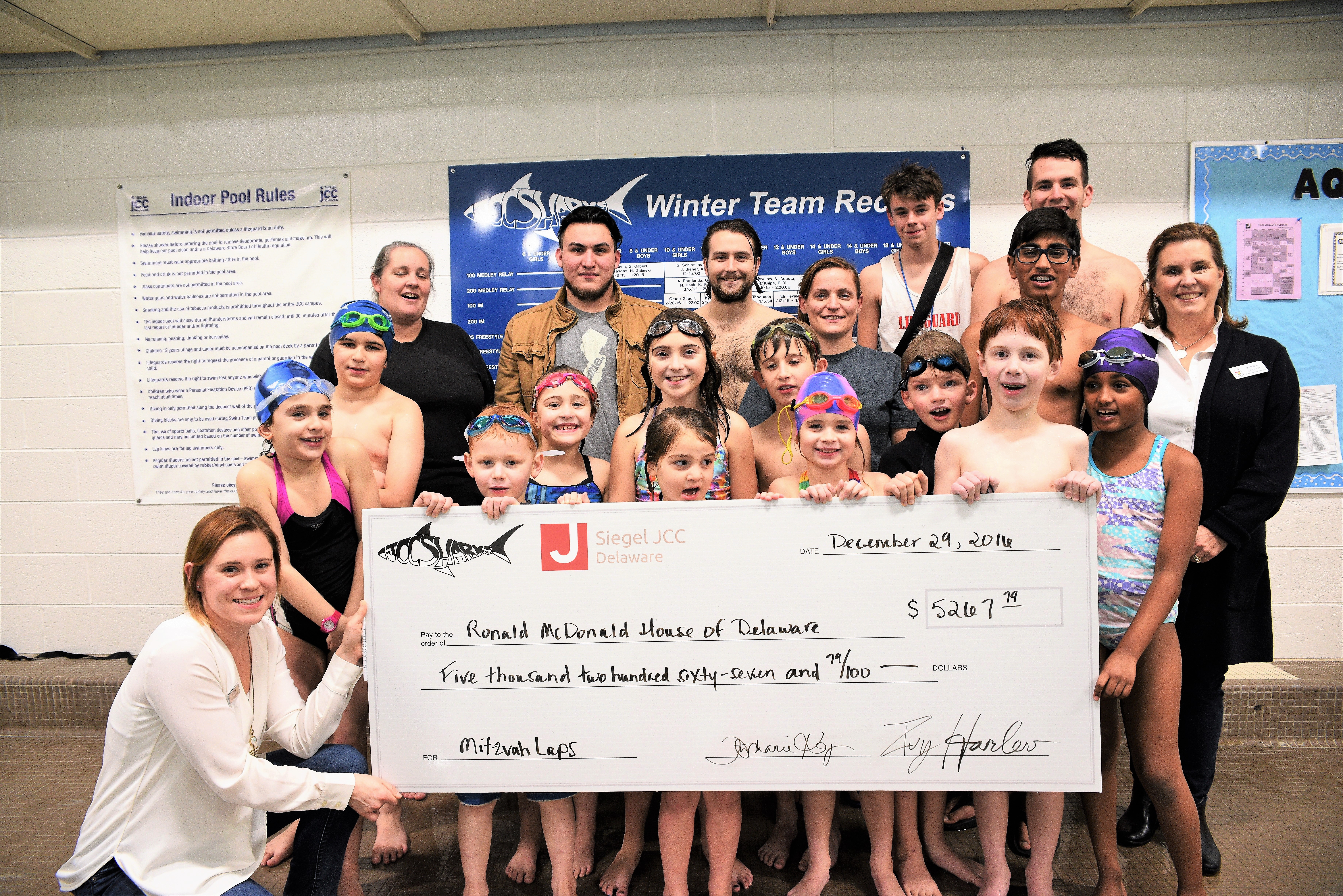 Together, our Sharks swam 6,770 laps and raised a total of $7,220.95, making a donation of $5,415.71 to the Ronald McDonald House of Delaware.